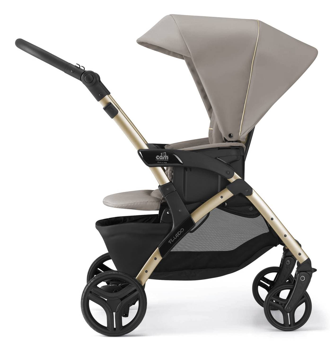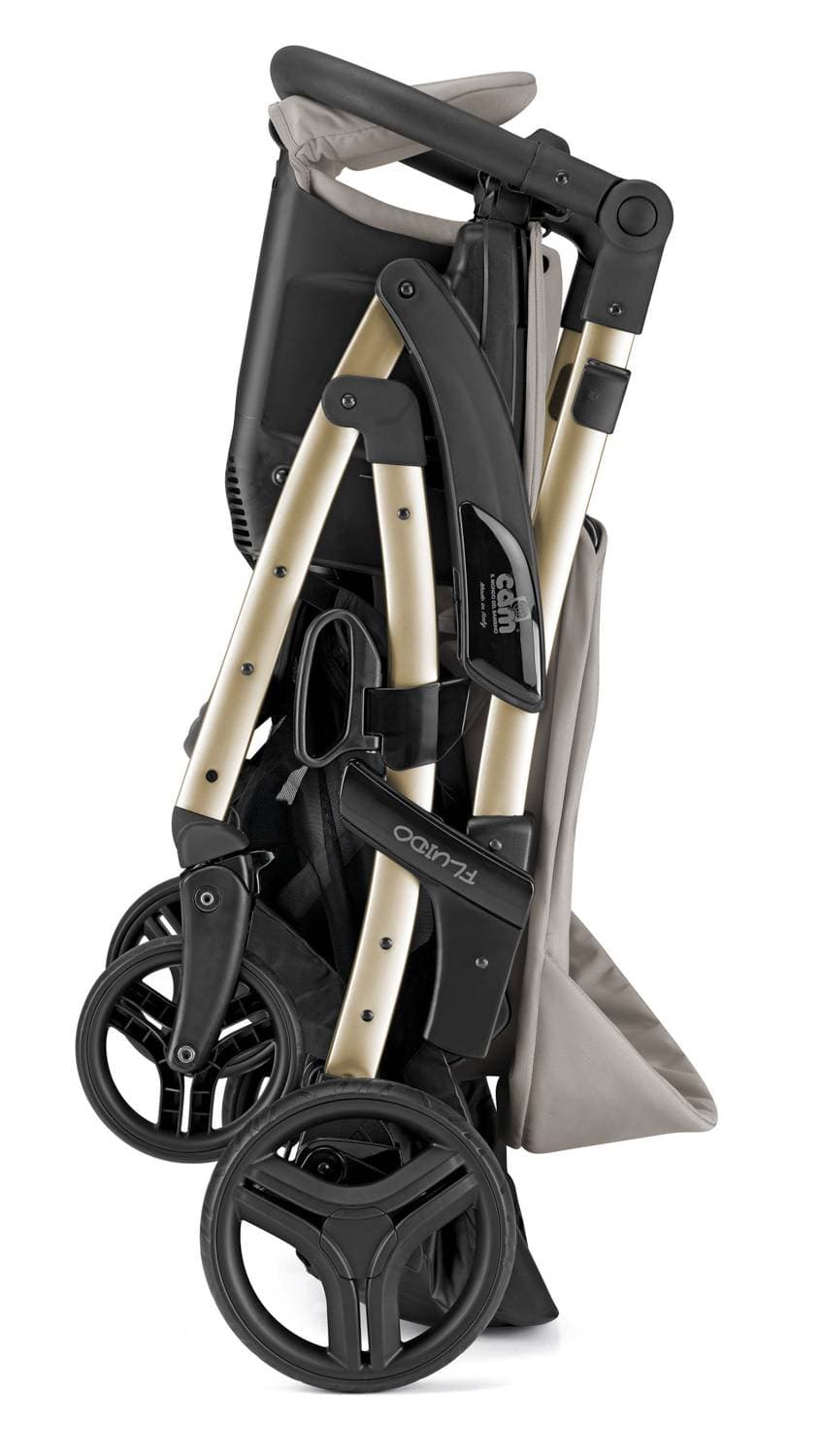 Cam Fluido Easy je variáciou obľúbeného mestského modelu Cam Fluido City. Líši sa melange prevedením poťahov so špecifickým preložením s gombíkom na nánožníkoch. Športovú časť môžeš otočiť v smere i protismere jazdy. Chrbtová a nožná opierka sa polohujú osobitne až do ľahu. Fluido Easy zakúpiš v kombinácii s priestrannou hlbokou vaničkou. Pomocou dokúpiteľného autokitu je využiteľná aj ako autovanička. Súčasťou trojkombinácie je aj autosedačka nakliknuteľná priamo na podvozok. XXL nákupný košík môžeš vzadu sklopiť pre lepší prístup. Odpružené menšie kolesá sú určené na menej náročný mestský terén. Vo výbave má kočík okrem pláštenky aj tašku a zateplený nánožník.