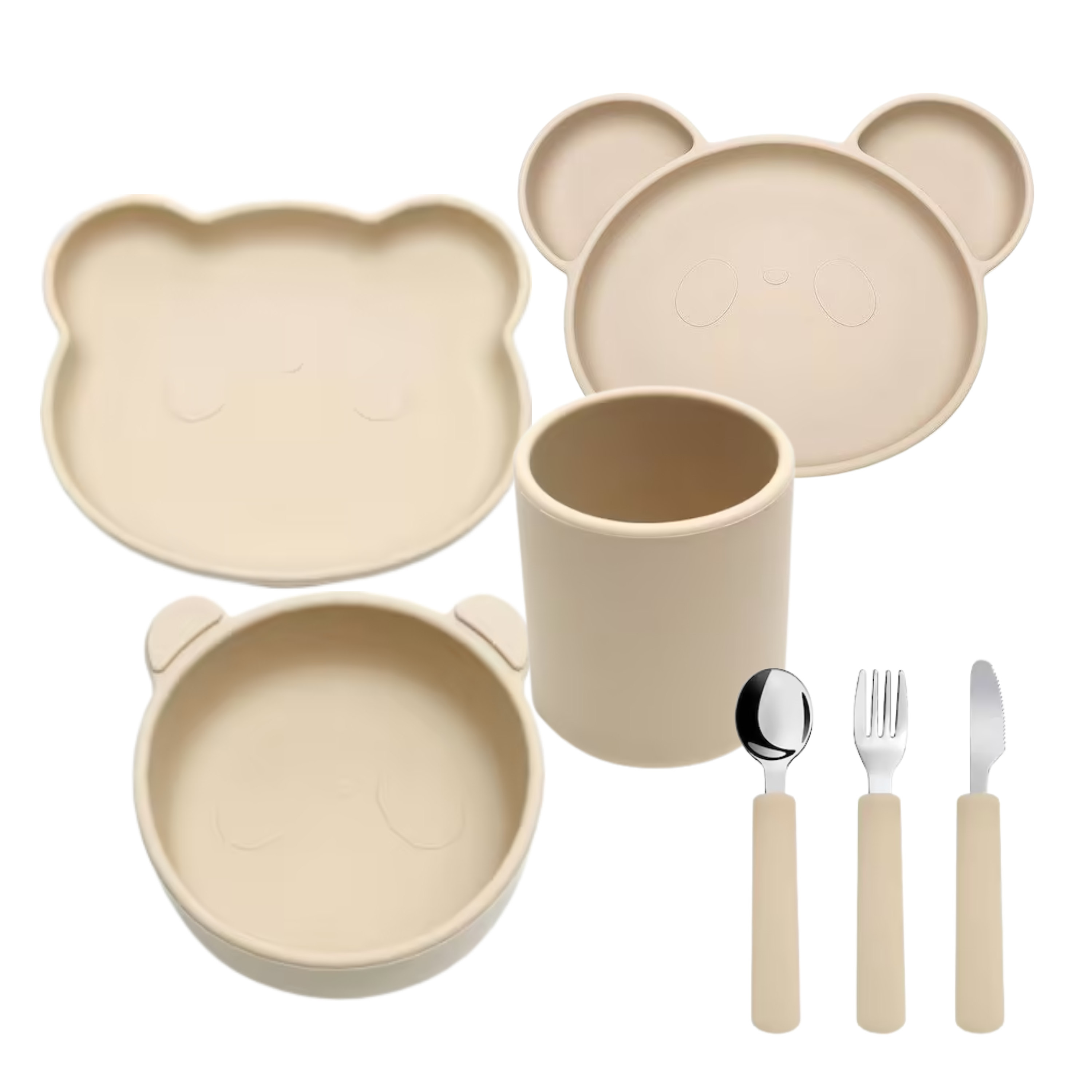 Viacdielna jedálenská súprava navrhnutá špeciálne pre staršie deti. Silikónový riad sme doplnili o príbor s nožíkom na prvé učenie krájania. Súpravu si môžete farebne zladiť podľa seba, a zároveň tak aj ušetriť. Dizajn pandy poteší aj staršie deti a z vlastnej skúsenosti vieme, že tento riad dokážu používať veľmi dlho.